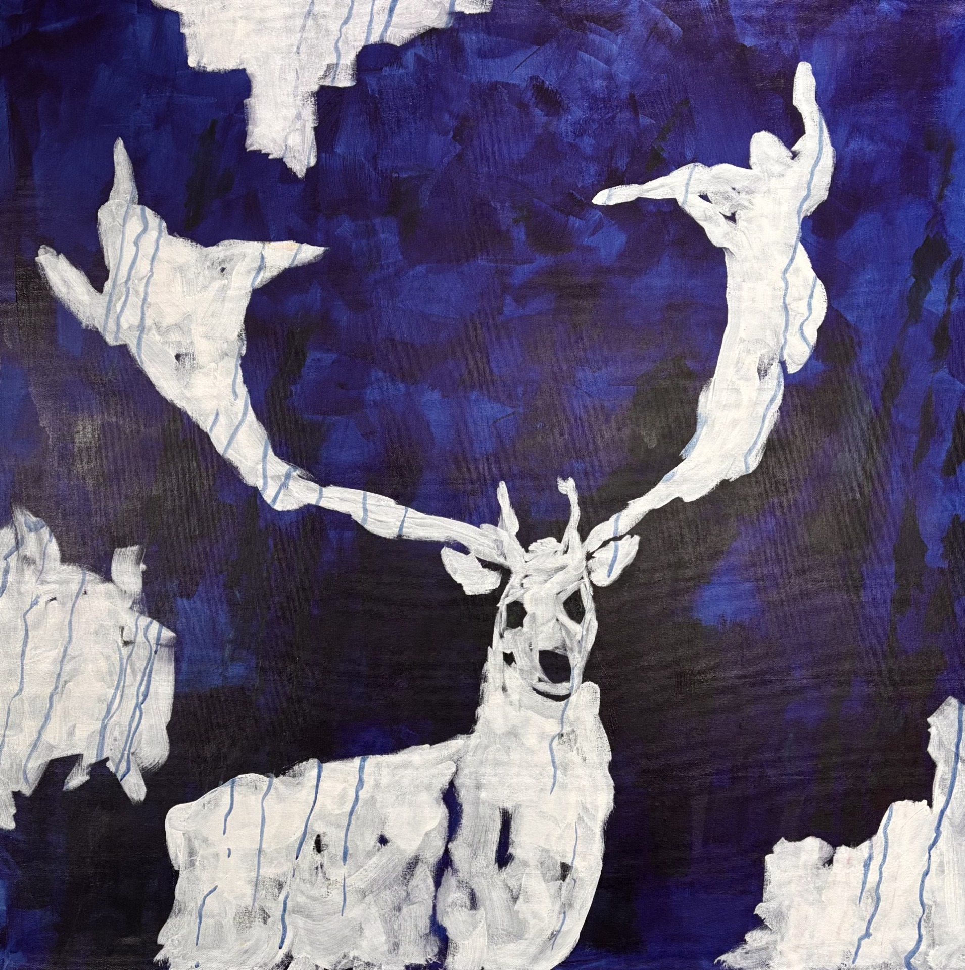 Kronhjort - set i Hindsgavl dyrehave, Acryl på lærrede,80 x 80 cm, 3000 kr.